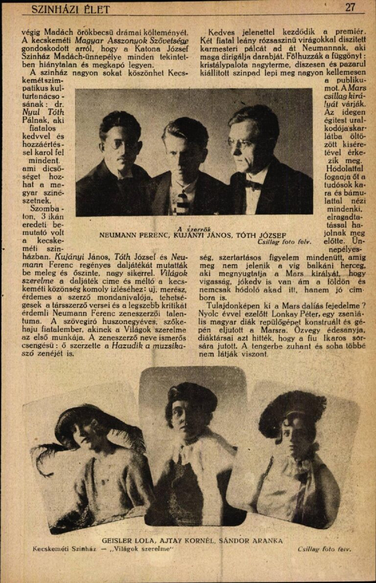 (A Színházi Élet kiküldött munkatársától.) (…) Szombaton, 3- ikán eredeti bemutató volt a kecskeméti színházban. Kurányi János, Tóth József és Neumann Ferenc regényes daljátékát mutatták be meleg és őszinte, nagy sikerrel. Világok szerelme a daljáték címe és méltó a kecskeméti közönség komoly ízléséhez: új, merész, érdemes a szerző mondanivalója, tehetségesek a társszerző versei és a legszebb kritikát érdemli Neumann Ferenc zeneszerzői talentuma. A szövegíró huszonegy éves, szőkehajú fiatalember, akinek a Világok szerelme az első munkája. (…) Fölhúzzák a függönyt: kristálypalota nagyterme, díszesen és pazarul kiállított színpad lepi meg nagyon kellemesen a publikumot. A Mars csillag király várják. Az idegen égitest uralkodója skarlátba öltözött kíséretével érkezik meg. Hódolattal fogadja őt a tudósok kara és bámulattal nézi mindenki, elragadtatással hajolnak meg előtte. Ünnepélyesség, szertartásos figyelem mindenütt, amíg meg nem jelenik a víg balkáni herceg, aki megnyugtatja a Mars királyát, hogy vigasság, jókedv is van ám a földön és nemcsak hódoló akad itt, hanem jó cimbora is. Tulajdonképen ki a Mars daliás fejedelme? Nyolc évvel ezelőtt Lonkay Péter, egy zseniális magyar diák repülőgépet konstruált és gépén eljutott a Marsra. Özvegy édesanyja, diáktársai azt hitték, hogy a fiú Ikaros sorsára jutott. A tengerbe zuhant és soha többé nem látják viszont.